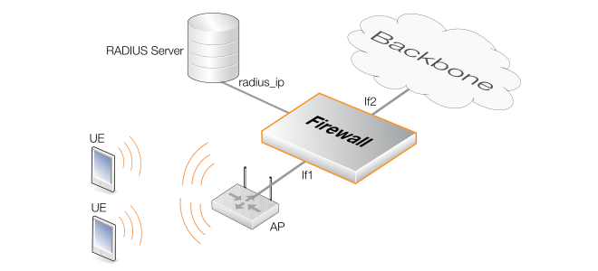 This example shows how to configure a Radius Relay object for the scenario illustrated below. Here, client devices (UE) must access data services through a backbone network via an Access Point (AP). First, they must be authenticated against a RADIUS server and then allocated an IP address. The AP is connected to the physical If1 Ethernet interface of a Clavister firewall and the backbone network is connected to the If2 interface.