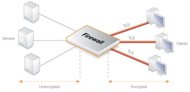 cOS Core supports TLS termination so that the Clavister firewall can act as the endpoint for connections by HTTP web-browser clients (this feature is sometimes called SSL termination).