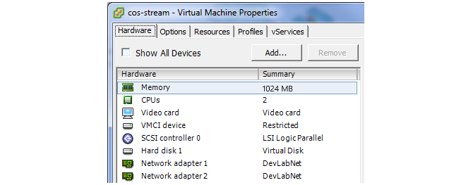 The default VMware virtual machine provides 1024 Mbytes of RAM memory. This is the absolute minimum value needed for cOS Stream to run. Many scenarios may need a higher amount of memory so the RAM size should be adjusted according to the requirements. It is recommended to have 2 cores allocated but cOS Stream can run on a single core. |
