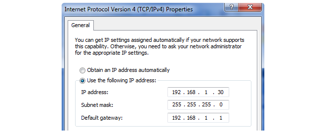 The IPv4 address 192.168.1.30 will be used for this purpose and the steps to set this up with Windows 7 are as follows: